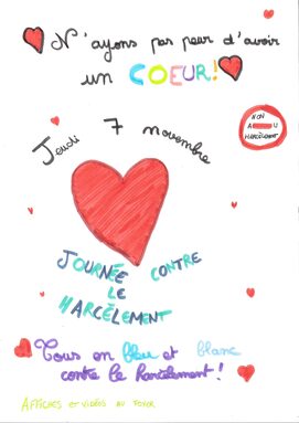 La journée nationale contre le harcèlement aura lieu le jeudi 07 novembre. Des vidéos et des affiches réalisées par les Troisièmes seront exposées au foyer. Tous les élèves et personnels du collège sont invités à venir habillés en bleu et blanc.